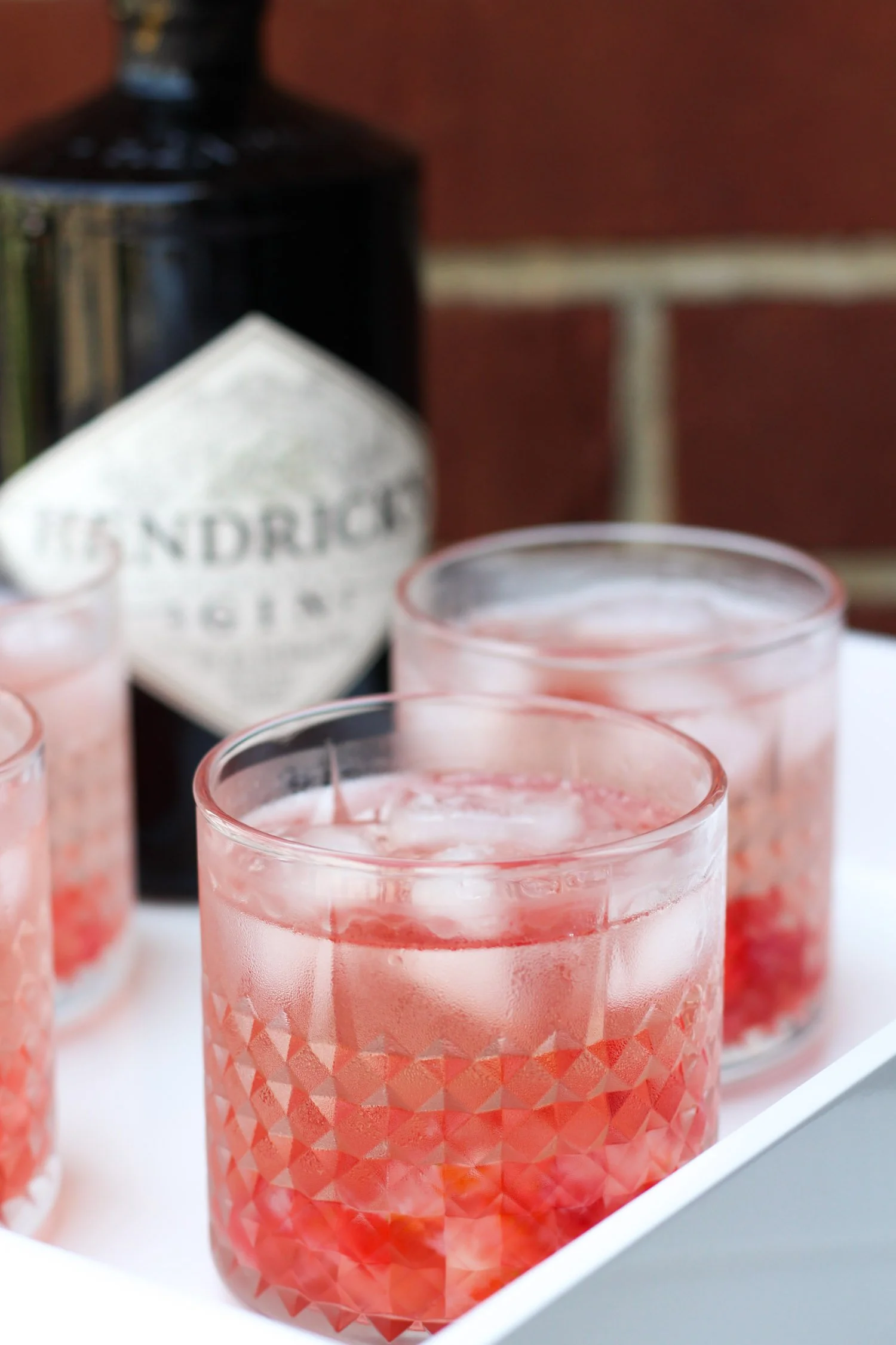 Pour rosé, seltzer, gin, and strawberries into a glass and stir well. Top with 4-5 cubes of ice and serve immediately.