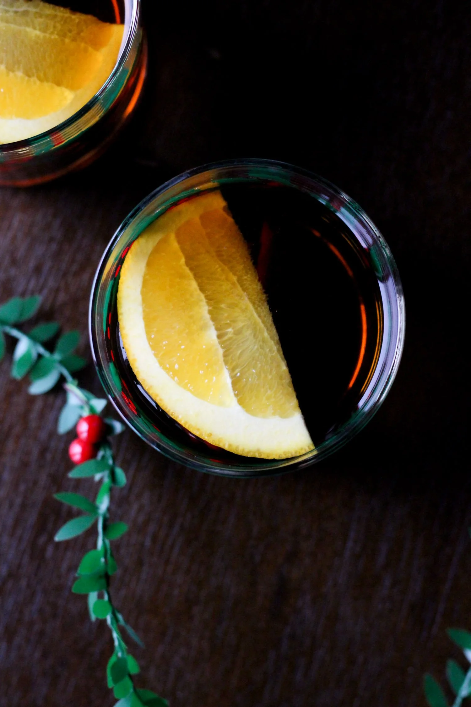 Once the mix on the stove is hot, pour into glasses and garnish with orange slices and a cinnamon stick. The drink is strong, so squeeze the orange slice and add more if desired. Serve hot, ideally, but it tastes good either way!